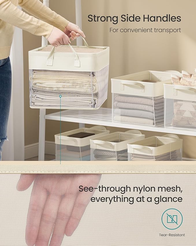 SONGMICS ClosetOrganizers Set of 3, Medium Fabric Storage Baskets, Foldable Organizer with Transparent Nylon Mesh, 15.7 x 11.8 x 9.8 Inches, Handles, for Bedroom, Living Room, Cream White URFB940W01