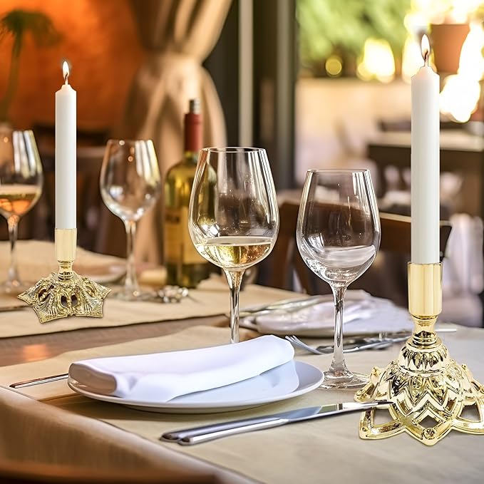 - Sturdy Gold Metal Candle Holders – Crafted from high-quality alloy, these taper candle holders feature a professionally plated and polished finish that is durable, rust-resistant, and easy to clean. Designed to securely hold standard ¾-inch taper candles.