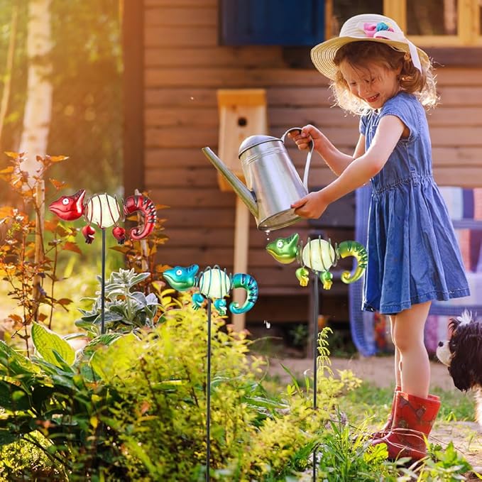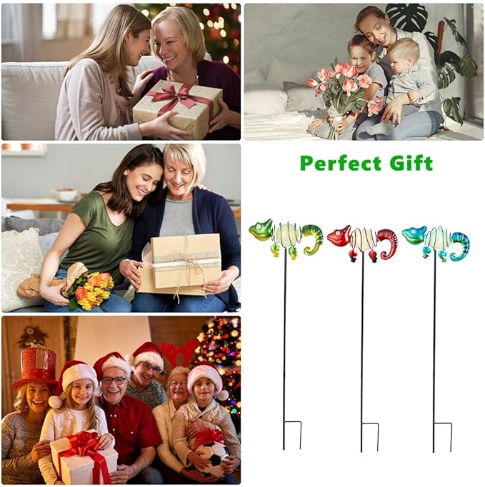 - Unique Design: These garden stakes are designed in the shape of vivid chameleons. The bright and eye-catching colors, including red, blue, and green, can quickly become the focal point of any garden. Each chameleon has a detailed and cute appearance, adding a touch of fun and liveliness to your outdoor space