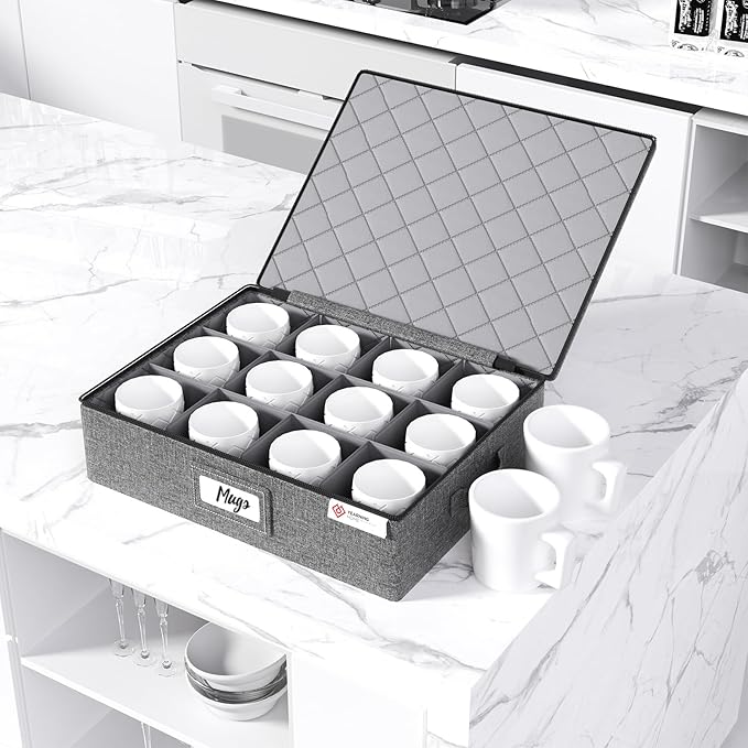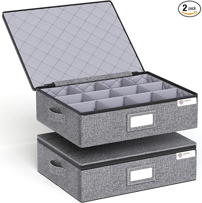 YearningHome Cup and Mug Storage Box with Hard Shell and Dividers for Coffee Mugs,Tea Cups and Glasses,Stackable Storage Organizers with Lid,Handles,Zips and Lable for Moving,Holds 12,2 Pack, Grey