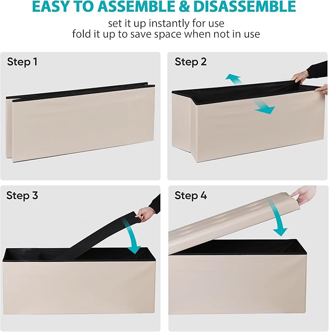 - Sturdy & Durable -- This comfortable long storage ottoman is made of quality thick cardboard, durable faux leather, has the load bearing capacity up to 350lbs. Waterproof linen fabric, built-in thickened sponge, make the cushion is soft and comfortable. The padded top is soft enough for sitting but firm enough to support you when folding laundry or having a quick seat.