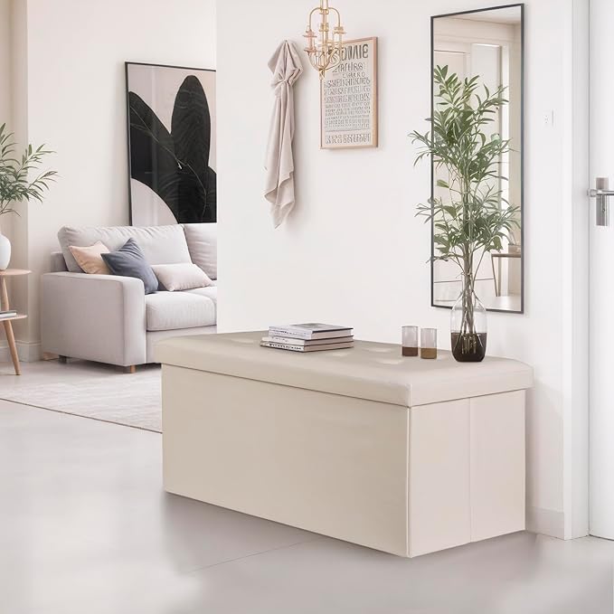 SUPER DEAL Folding Ottoman Bench with Storage, 43 Inch Padded Seat Footrest Shoes Bench for Bedroom Living Room Entryway, 660 lbs Capacity 43"x 15"x 15", Faux Leather, Beige
