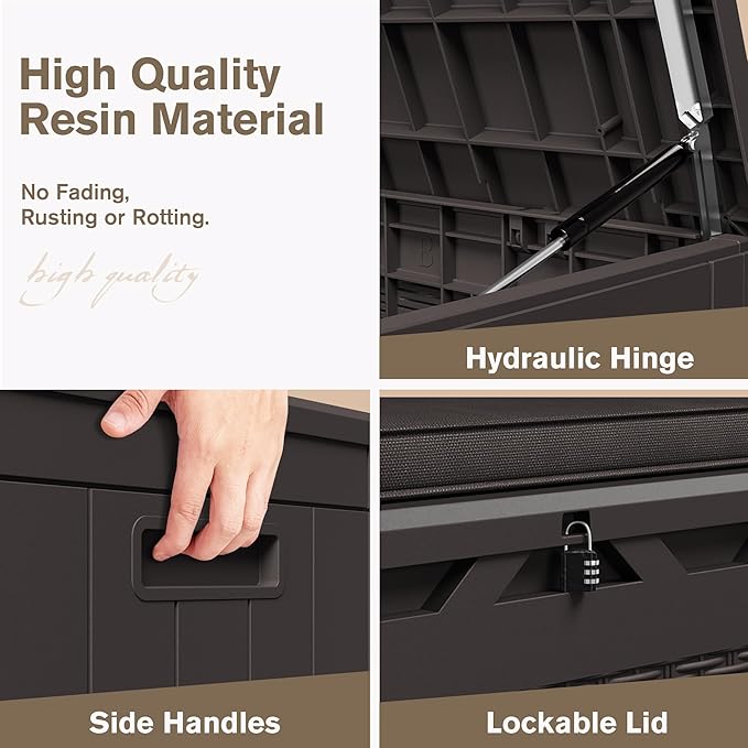- High Quality Resin Material: Crafted from sturdy, long-lasting materials, this deck box is built to protect your belongings from dust, dirt, and moisture. The reinforced base ensures that it can support your items without collapsing or warping
