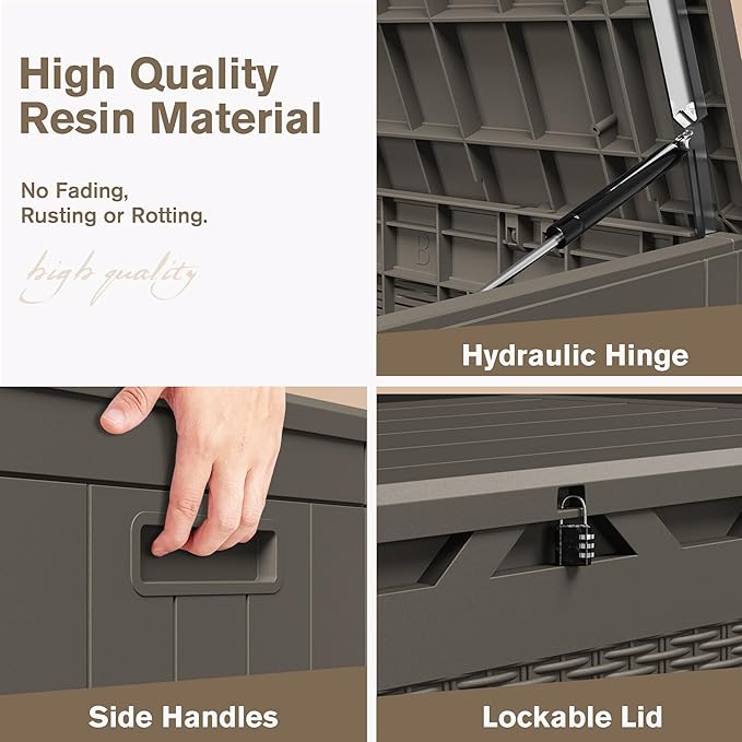- High Quality Resin Material: Crafted from sturdy, long-lasting materials, this deck box is built to protect your belongings from dust, dirt, and moisture. The reinforced base ensures that it can support your items without collapsing or warping
