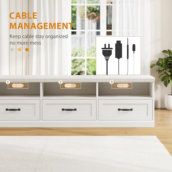 - CABLE MANAGEMENT: This entertainment stand features 3 metal handles for a sophisticated touch. The drawers open smoothly and quietly for easy access, keeping your space organized and clutter-free. With 3 cable holes at the back, this tv entertainment center effectively conceals cables for a tidy, streamlined appearance