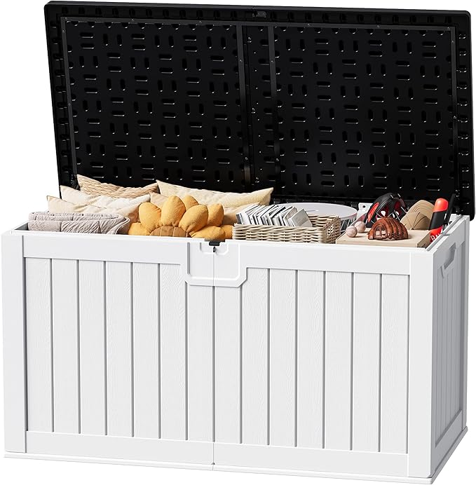 - Durable Construction: With the resin material, this deck box is built to withstand heavy use and protect your items from the dust
