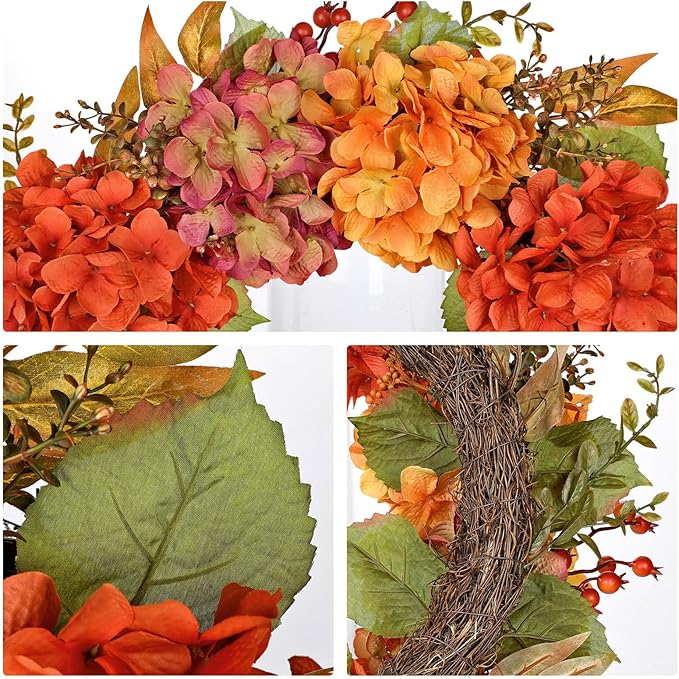 Artificial Fall Wreath for Front Door – 24 Inch Hydrangea Floral Wreath with Orange & Burgundy Flowers, Autumn Thanksgiving Door Décor