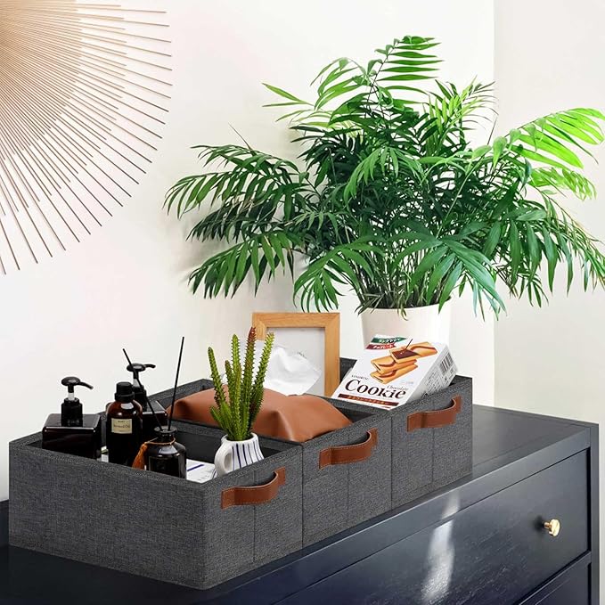 - 👍【QUALITY MATERIAL】Storage baskets for shelves are made of high-quality cationic fabric and polyester cotton fabric, and the inner layer is made of non-woven fabric, which is odorless, long-lasting and strong. Classic faux leather handles that adds a comfortable touch and provides a strong and comfort grip to pull and move. Fabric storage bin is easy to clean, just wipe with a damp sponge or cloth