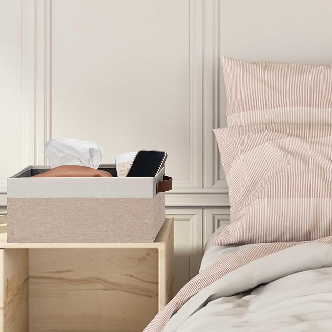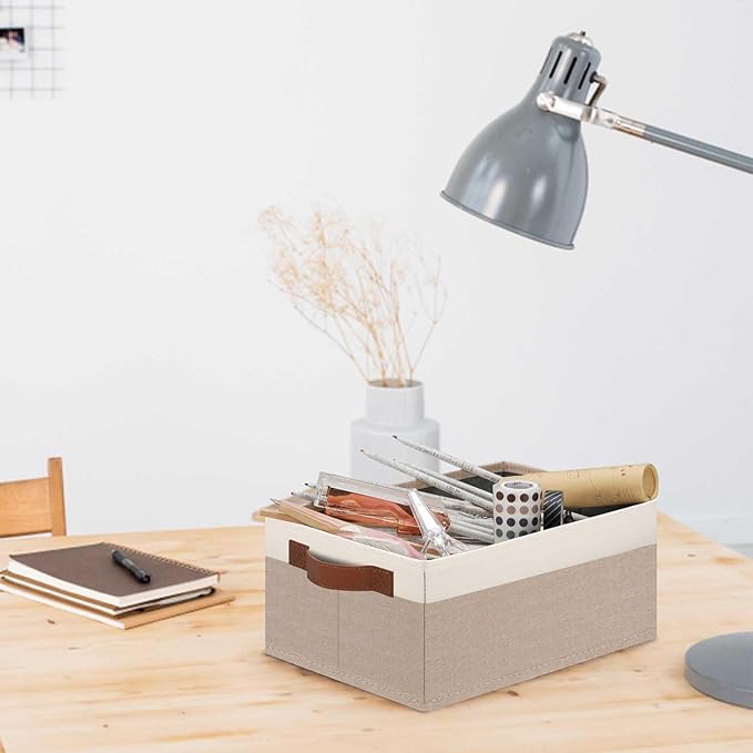 - 👍【QUALITY MATERIAL】Storage baskets for shelves are made of high-quality cationic fabric and polyester cotton fabric, and the inner layer is made of non-woven fabric, which is odorless, long-lasting and strong. Classic faux leather handles that adds a comfortable touch and provides a strong and comfort grip to pull and move. Fabric storage bin is easy to clean, just wipe with a damp sponge or cloth.