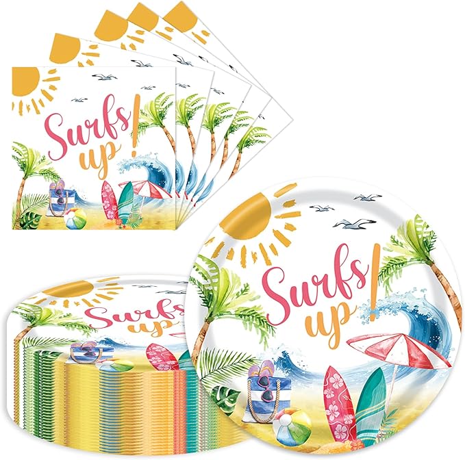 - Summer Beach Plates & Napkins Set – This vibrant collection features 40 pieces (9inch plates 20 pcs & napkins 20 pcs)of summer party supplies, including tropical plates, napkins, and coordinating beach-themed surf designs. Each piece displays lively beach motifs like palm trees, waves, and sunsets, creating an instant summer vibe for pool parties, barbecues, or coastal gatherings.