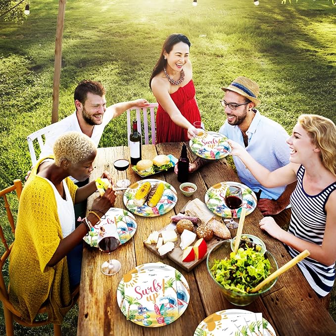 - Complete Beach Party Kit – Includes 20 dinner-sized beach plates (9”), 20 tropical-print napkins—ideal for serving 16 guests. Whether hosting a luau or poolside bash, this set ensures every dish and drink stays mess-free and photo-ready.