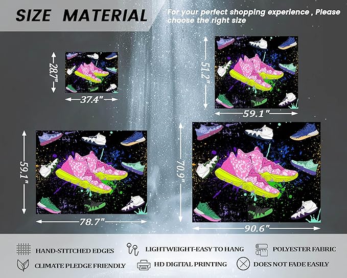 - Fabric: Basketball shoes tapestry is made of polyester fabric, which is soft, comfortable, durable, breathable and wrinkle-proof. It is not easy to fade and can maintain its original beauty for a long time.