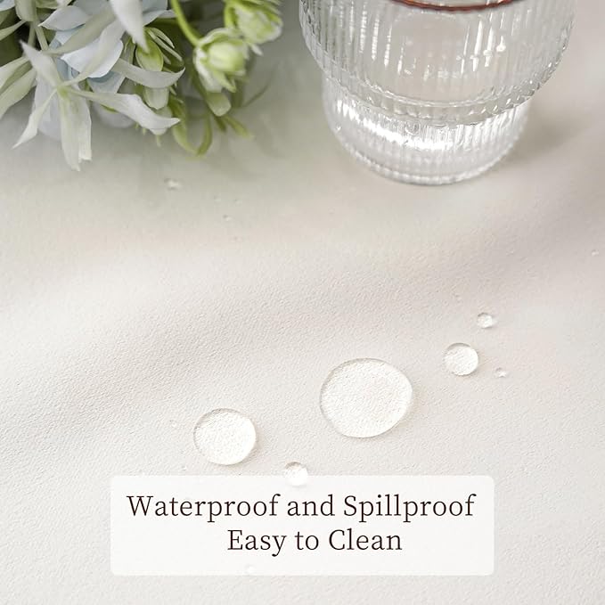 - Premium Waterproof Tablecloth: This rectangle tablecloth is made of a polyester-cotton blend that is waterproof, soft, and thick. The front of the table cloth is an elegant cream color, and the reverse is a calm brown