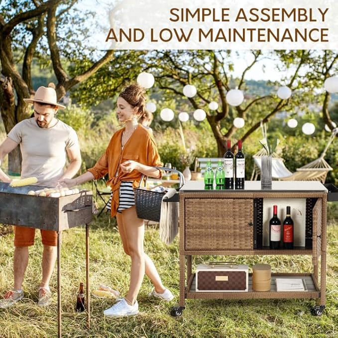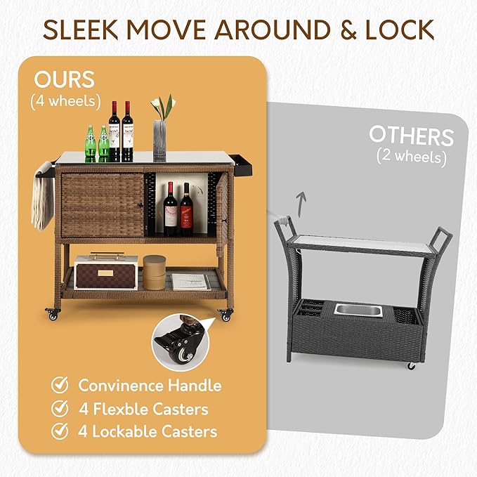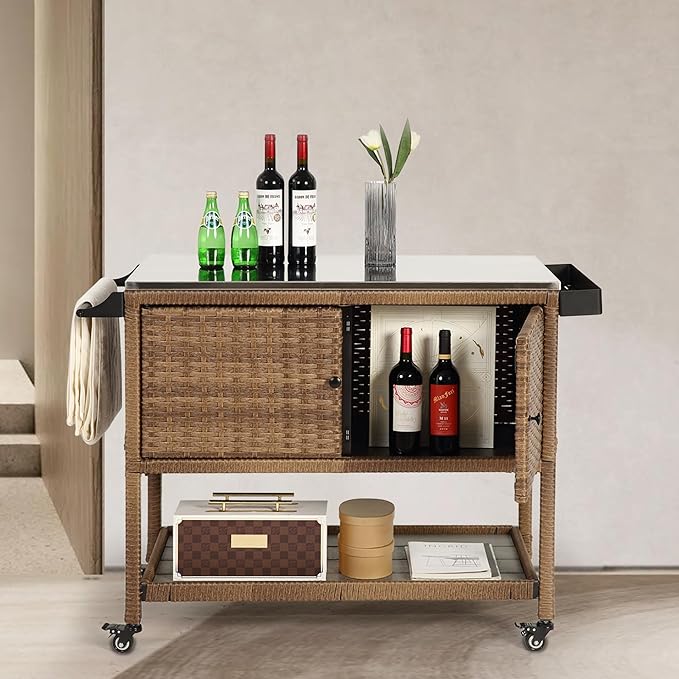 - IDEAL FOR GRILLING EVENTS: This wicker bar cart’s stainless steels top that can hold your BBQ grill or utensils. The side draining rack is perfect for holding sauces, spices, or condiments. Ideal for outdoor gatherings, making grilling easier and more enjoyable