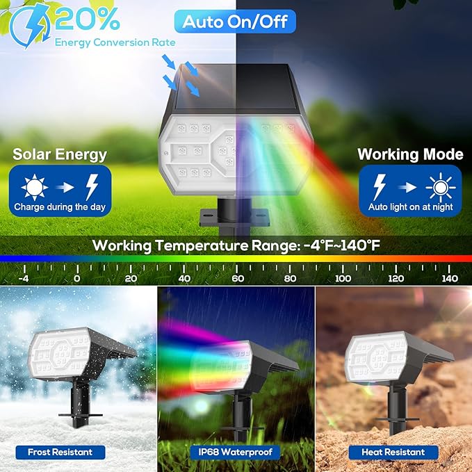 - Solar Yard Lights: Outdoor Lights are Waterproof, Frostproof, and Weatherproof - Using ABS high-strength material, these lights can work under -4℉~140℉. The IP68 waterproof rating allows the solar garden lights to withstand all kinds of bad weather such as rain, snow, wind frost, high temperature, etc. It is perfect for outdoor use! Anti-fogging design - can perfectly solve the problem of fogging on the lens, maintaining light intensity and prolonging the service life.