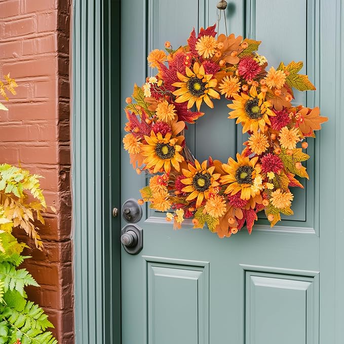 GENMOUS 24 Inch Fall Wreaths for Front Door, with Mini Pumpkin Skewers- Sunflower Wreath, Autumn Fall Decor Maple Leaf Daisy Thanksgiving Halloween Home Party Fall Decoration Indoor Oudoor