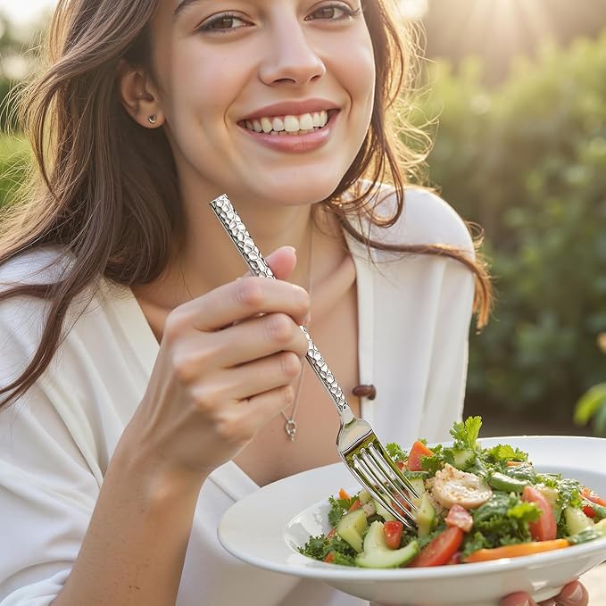 - Elegant Hammered Design: The hammered silverware set finish and trapezoid handles of flatware set for 8 not only offer a comfortable grip but also exude sophistication. Meticulously polished, it adds a touch of luxury to any table setting