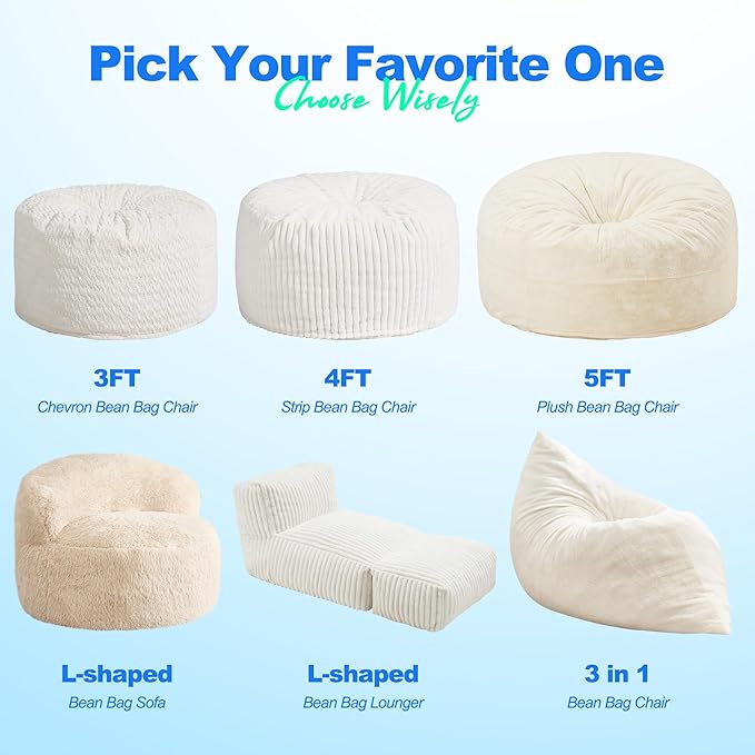 - 3 in 1 Convertible Bean Bag Chair: Big bean bag chair is versatility in adjusting to various shapes makes it a ideal fit for any room, whether it's for unwinding in the living room, creating a cozy reading nook in the bedroom, or setting up a snug study spot in a dorm. As a 3 in 1 product, bean bag bed for adults can be used as a traditional bean bag chair, lean it up against a wall like a bean bag sofa, or laid out as a bean bag floor cushion.