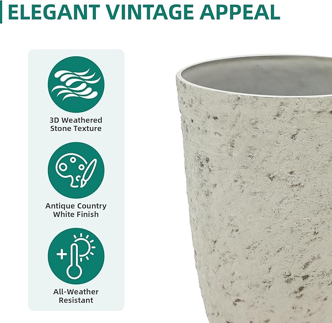 - Elegant Vintage Appeal:Featuring an antique country white finish and 3D weathered stone texture, these tall planters bring a touch of vintage charm. It can instantly elevate the style of your front porch, patio or living room.