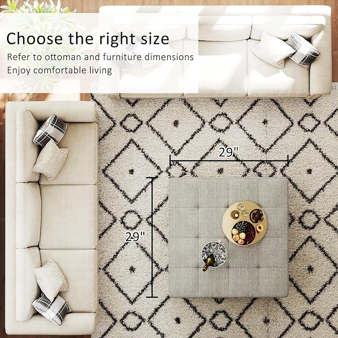 - Versatile Style: The large storage ottoman uses high quality linen fabric, durable and not easy to fade. The square ottoman runner adopts classic tufting design, the table leg light walnut color, elegant and beautiful, can match with any furniture environment