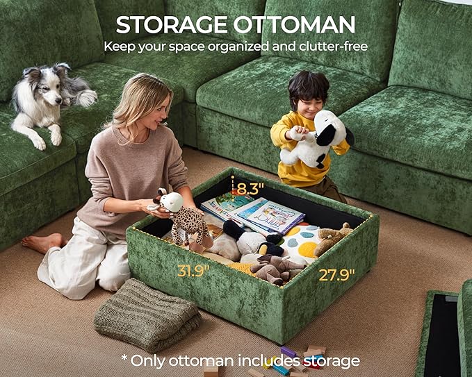 - 【Optional Hidden Storage for a Tidy Space】 Maintain a clutter-free home with the optional storage ottoman module, designed to keep blankets, pillows, or toys neatly tucked away. Convertible Couch with storage ensures essentials are always within reach yet out of sight, adding both function and style to your oversized fluffy modular sofa. Note: Storage is only available in configurations with the ottoman module