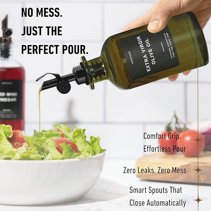 - PROTECT YOUR OIL IN STYLE: This elegant green olive oil bottle set is crafted from UV-blocking glass to preserve flavor, nutrients, and freshness. Whether you're storing extra virgin olive oil or avocado oil, your oils stay safe from sunlight and oxidation.