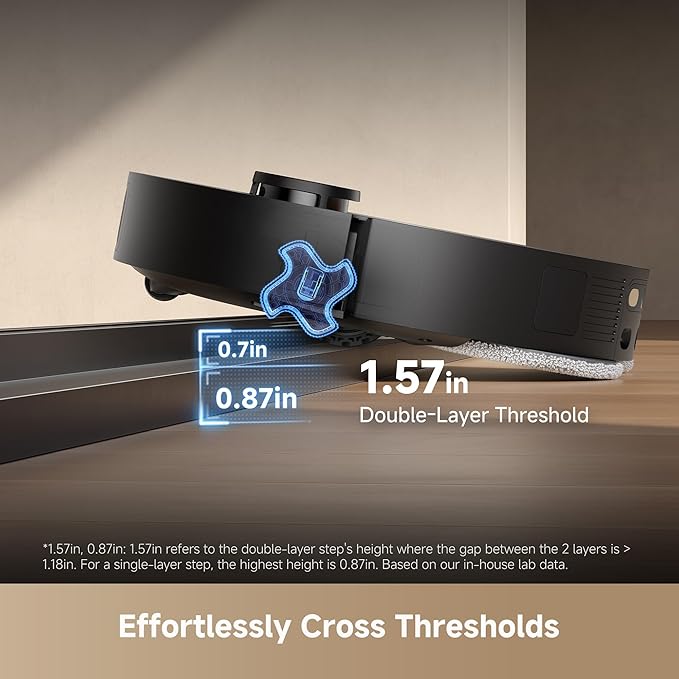 - Cross Obstacles with Ease: The advanced EasyLeap system, equipped with main and auxiliary climbing wheels, enables the robot vacuum to effortlessly cross thresholds, door tracks, and steps up to 1.57in high, so it doesn't get stuck or collide during a clean.