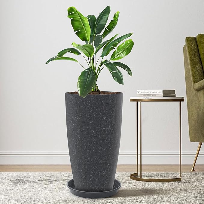 Tall Flower Pot Indoor - Outdoor Plant Pot - Black Glossy Planter - Elegant Stone Imitation - 12" Diameter 21" Tall with Drainage Holes and Saucer