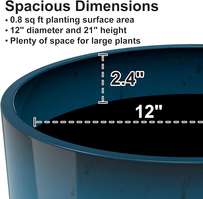 Tall Flower Pot Indoor - Outdoor Plant Pot - Turquoise Glossy Planter - Elegant Stone Imitation - 12" Diameter 21" Tall with Drainage Holes and Saucer