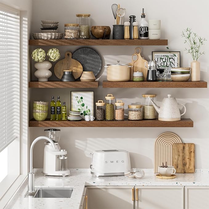 - Perfect Wall Decor: Handcrafted from premium 1.5" thick wood, our wood floating shelves boast a unique wood grain that infuses your space with timeless charm. Perfectly suited for any modern, traditional, rustic, or farmhouse decor, this shelf elevates the ambiance of your home and kitchen. With 5 colors and 4 sizes, you can creatively arrange your storage space with your style.