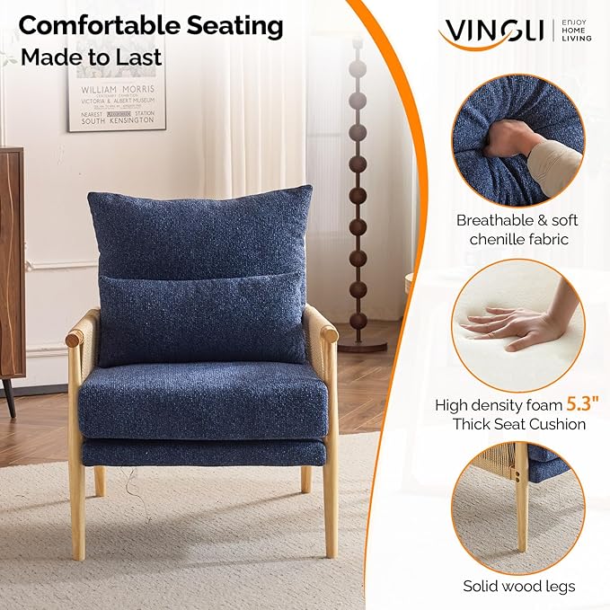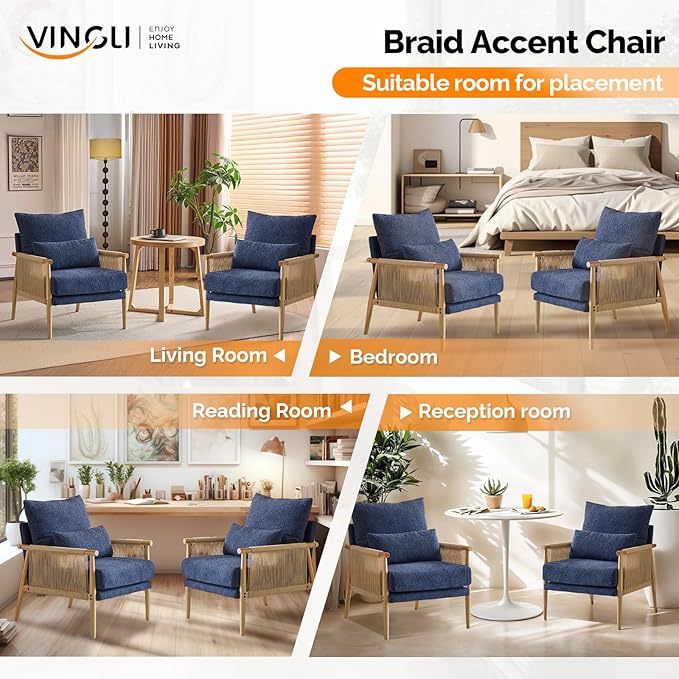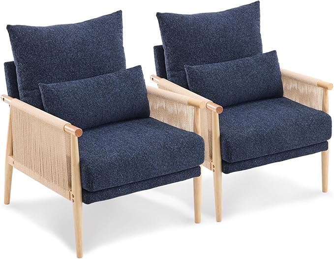 VINGLI Boho Braid Accent Armchairs Set of 2,Mid-Century Modern Chiars with Solid Wooden Armrest,Comfy Louge Cushion Chairs with Waist Pillow for Bedroom,Living Room,Reading Room, Blue