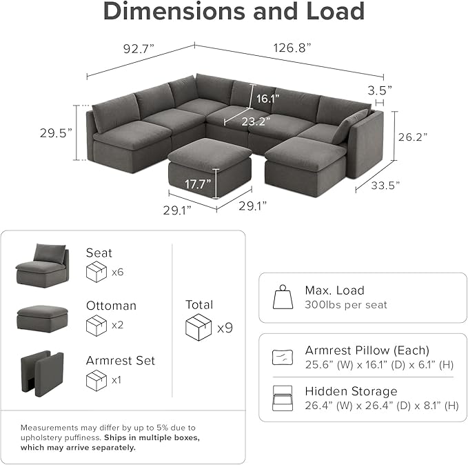 - Disclaimers: Colors may vary due to lighting and screen differences. Cushions are vacuum-packed and may take up to 7 days to fully expand. For best results, gently fluff and allow time to reach full volume. Measurements may differ by up to 5% due to upholstery puffiness. Ships in multiple boxes, which may arrive separately
