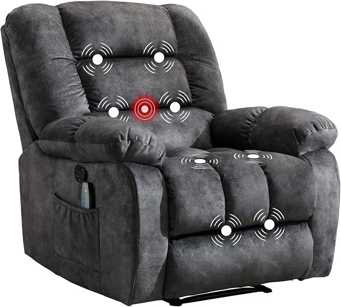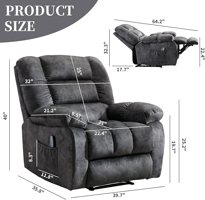 - 【Massage & Lumbar Heating】Relax in comfort with 8-point massage functionality and lumbar heating. This recliner targets key areas for your back, lumbar, thighs and legs to improve blood circulation, relieve tension, and reduce fatigue. Choose from 3 massage modes and adjustable intensity levels to customize your relaxation. The built-in timer lets you set 15, 30, or 60-minute heating sessions for convenience.