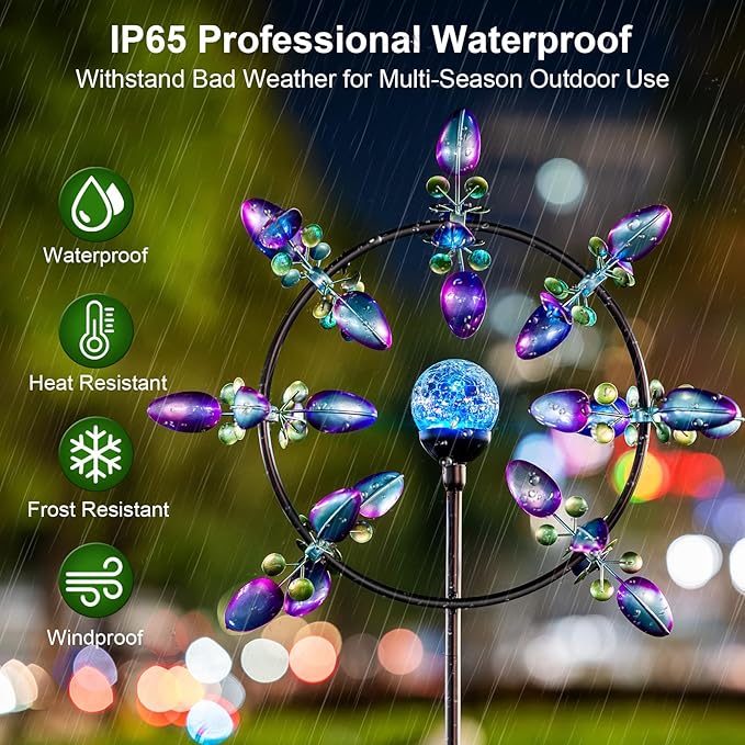 - 【Solar Powered Wind Spinners】Features a color changing LED crackle glass ball light which is powered by solar, Oversized 20.4-inch blades, and a durable metal garden stake. As night falls, it flashes a soft, jewel-like light, bright metal and changing lighting create visual enjoyment in the garden.