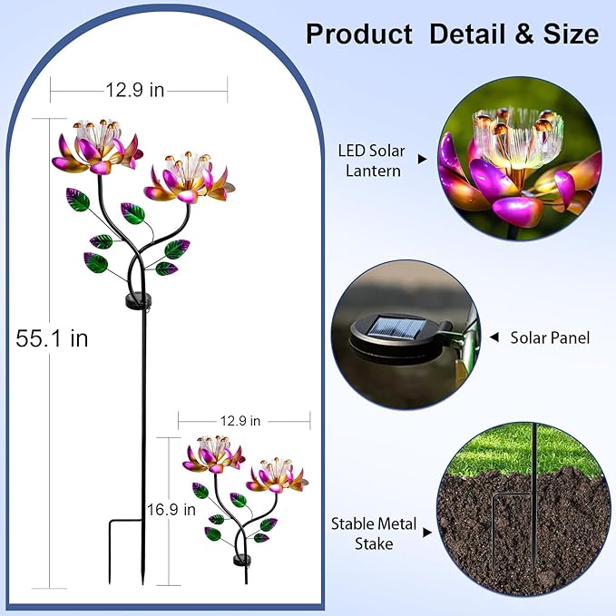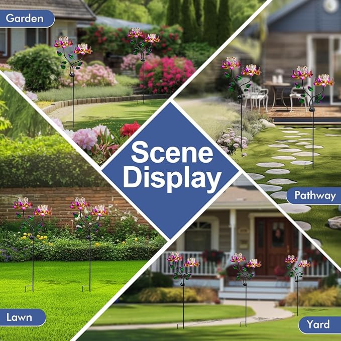 - STANDING STABLE: The metal stake of the solar weathervane has two sturdy metal spikes to ensure that the weathervane will stand up even in strong winds, allowing you to enjoy the graceful spinning of the flowers. The blades are also coated with a durable rust-resistant paint to withstand all weather conditions.