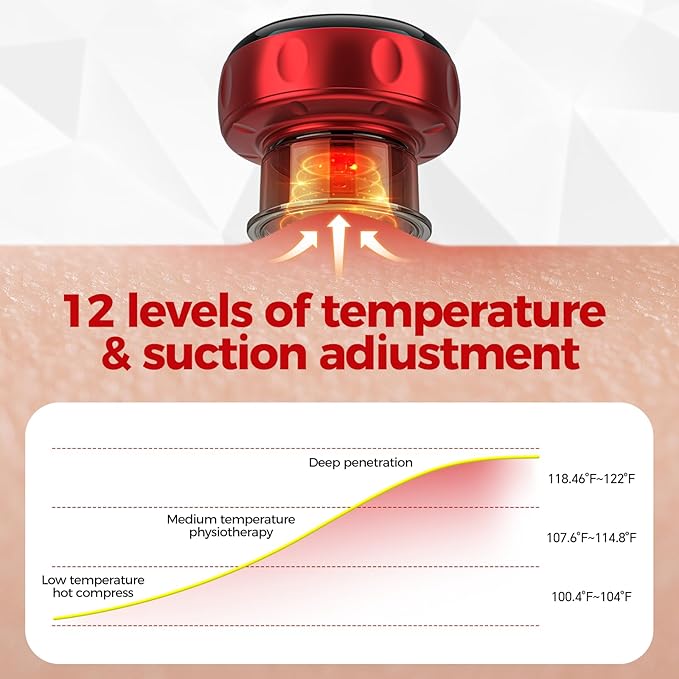 - 【12-Level Adjustable Temperature & Suction Control】Say goodbye to one-size-fits-all cupping! Our cupping kit for massage therapy lets you fine-tune suction strength (1-12) and heat (100°F-122°F)—from gentle warmth for stiff necks to firm grip for deep muscle knots. Caution: Prolonged use of the heating function on its highest settings (10-12) for over five minutes may cause skin burns