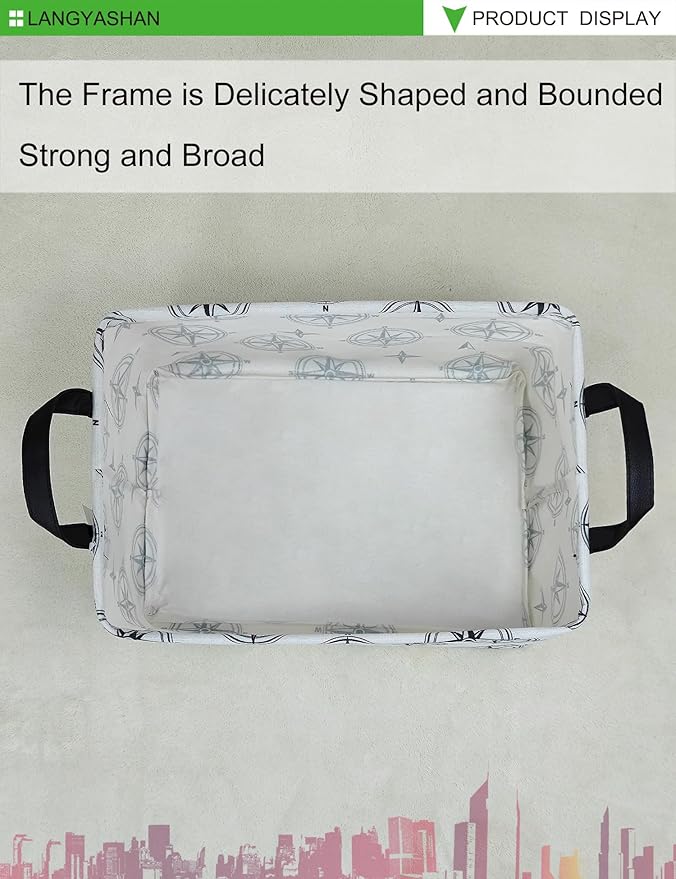 LANGYASHAN Rectangular Storage Bin Collapse Canvas Fabric Cartoon Storage Basket with Handles for Organizing Home Kitchen Boys and Girls Toys Office Closet Shelf Baskets (Rec Black Compass)