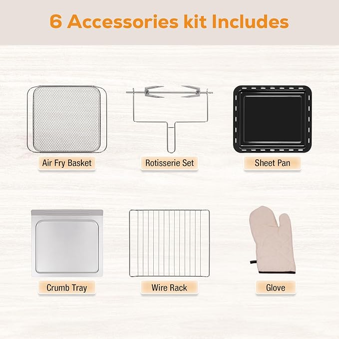 - ๐ฆ 6 Accessories for Everything: Air fry basket, wire rack, crumb tray, rotisserie kit, roast basket and glove.
