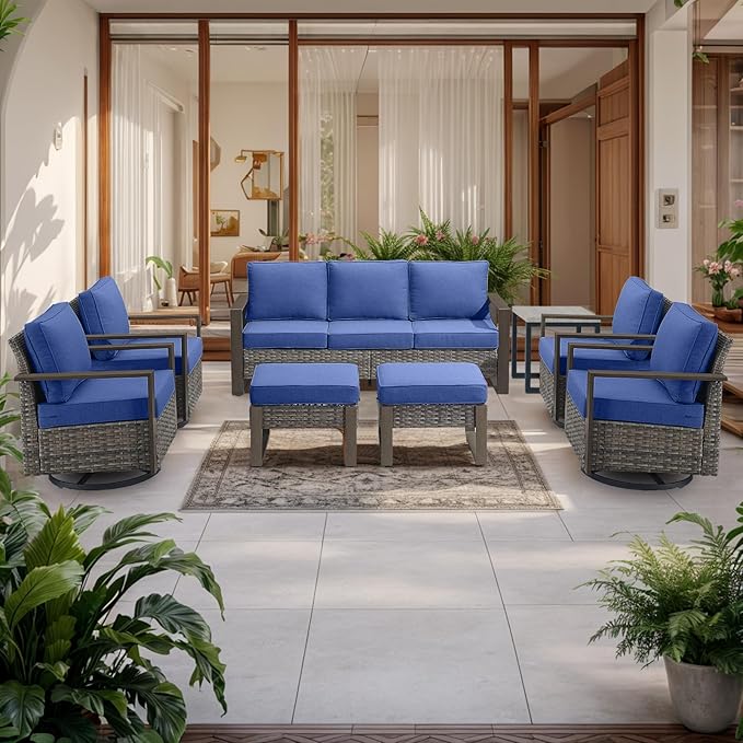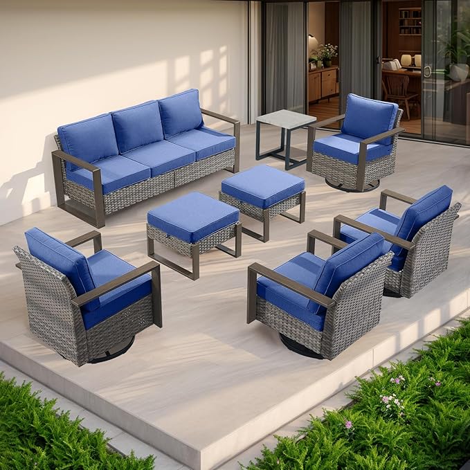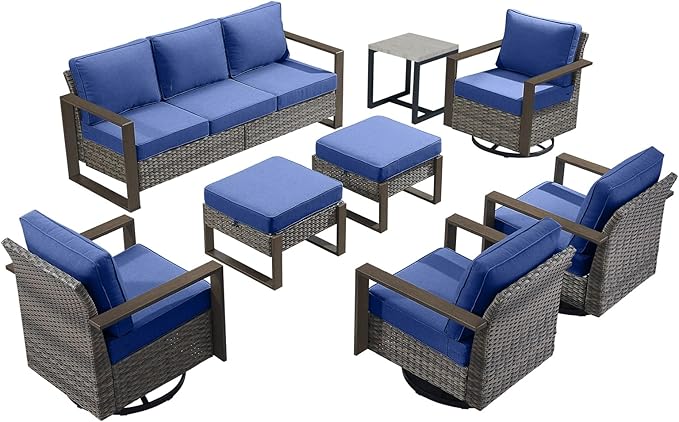 Outdoor Wicker Patio Furniture Set - 8 Piece Patio Conversation Set with 4 Wicker Swivel Rocker Chairs,2 Rattan Ottoman 1 Side Table and 1 Couch,Thick Cushions,Deep Seating(Mixed Grey/Blue)