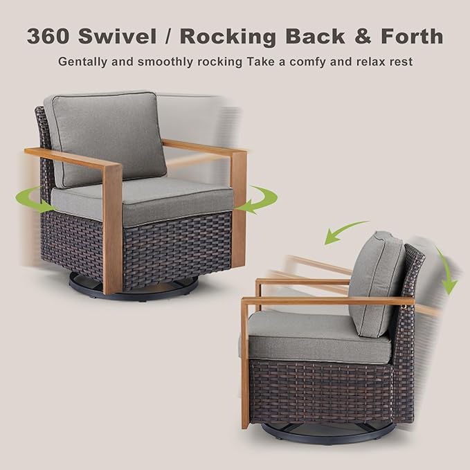 - Stylish Wood-Grain Finish:Elevate your outdoor space with our wicker patio furniture swivel chairs set, featuring a stunning faux wood-grain armrest design that mimics the beauty of natural wood. This environmentally friendly choice not only enhances the ambiance of your garden but also requires minimal maintenance, reducing the demand for real wood. Paired with handcrafted wicker, these sets add a modern touch to any outdoor decor, providing a fresh and inviting look