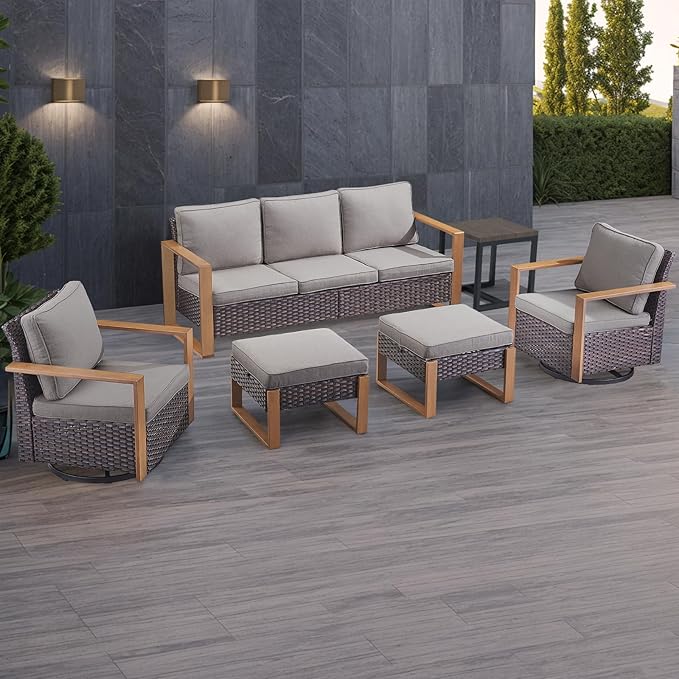 Outdoor Wicker Patio Furniture Set - 6 Piece Patio Conversation Set with 2 Wicker Swivel Rocker Chairs,2 Rattan Ottoman,1 Side Table and 1 Couch,Thick Cushions,Deep Seating(Brown/Grey)