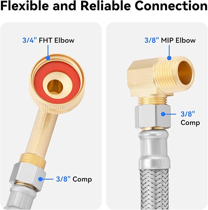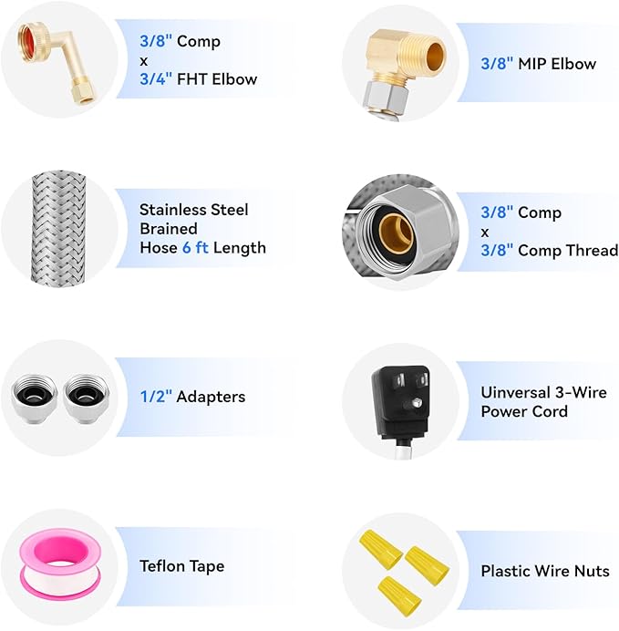 - Complete Installation Bundle: Includes 6ft stainless steel inlet hose, 6ft drain hose (1 pre-bent elbow + trim-to-fit end with clamp), plus adapters, 3-wire power cord, wire nuts, and Teflon tape – all in one kit for full setup.