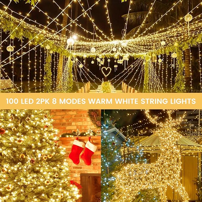 - Ultra-Bright and Durable Battery Powered String Lights: Each string light is 33 feet, features 100 super bright LEDs and a waterproof battery case with 8 lighting modes to ensure longevity and reliability. The warm white Christmas lights emit a classic, romantic and warm glow in the dark, making them an ideal choice for indoor and outdoor decorations. These fairy lights are perfect for Christmas, birthdays, parties, weddings, creating a cozy and joyful atmosphere.