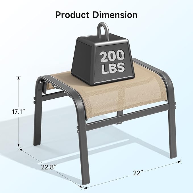- Long-lasting Outdoor Use: Our outdoor foot rest is created for longevity, featuring a high-quality Textilene fabric and a hard-wearing metal frame. The breathable fabric is water-proof and easy to maintain, and the iron frame can resist rust and sun exposure for a lifetime, so you can use the outdoor ottomans for patio in any weather conditions without worrying about it fading or breaking down over time
