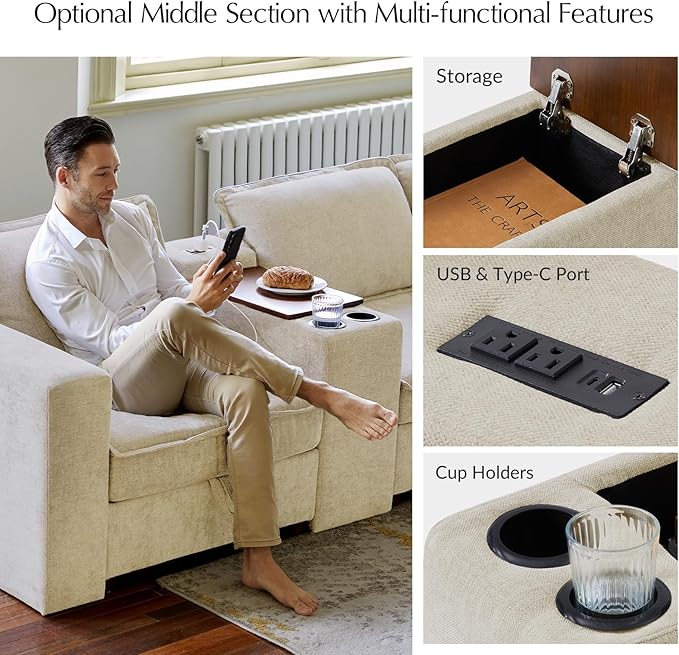 - Multi-functional Central Unit: The middle section includes storage, a tabletop, cup holders, and a socket with 1 USB + 1 Type-C port, providing convenience and practicality for your daily needs.