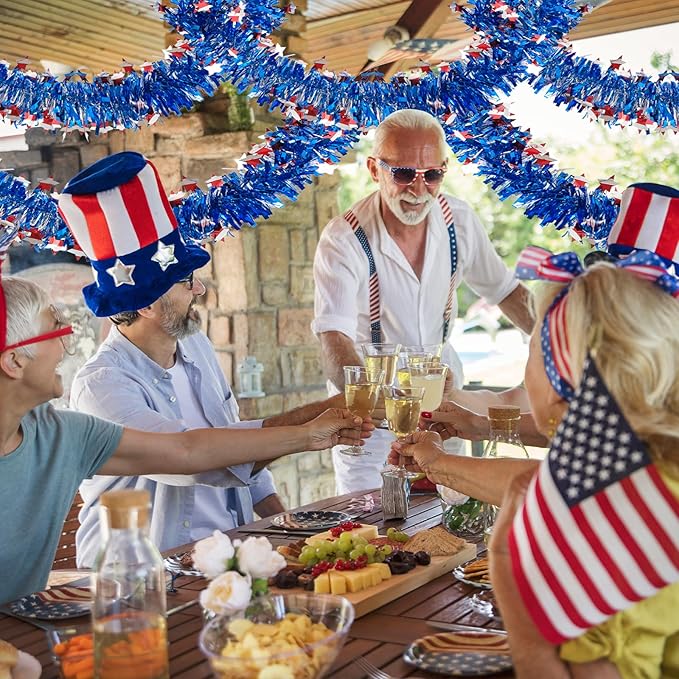 4th of July Patriotic Tinsel Garland Decoration 33FT, Red White and Blue Tinsel Garland with Shiny Star Metallic Garlands,Independence Day Memorial Day Decor for Home Indoor Outdoor