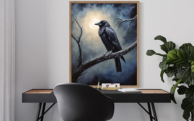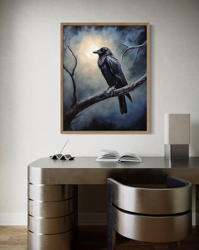 Crow under the Moonlight Poster Art Print, Halloween Scary Vintage Wall Art Academia Spooky Painting Decoration for Horror Prints, Gothic Posters Bedroom Decor 89 (Crow under the Moonlight, 8 x 10 inches, Wood Frame)