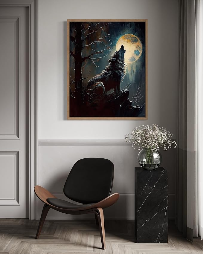 Wolf howling Poster Art Print, Halloween Scary Vintage Wall Art Academia Spooky Painting Decoration for Horror Prints, Gothic Posters Bedroom Decor 89 (Wolf howling, 8 x 10 inches, Wood Frame)