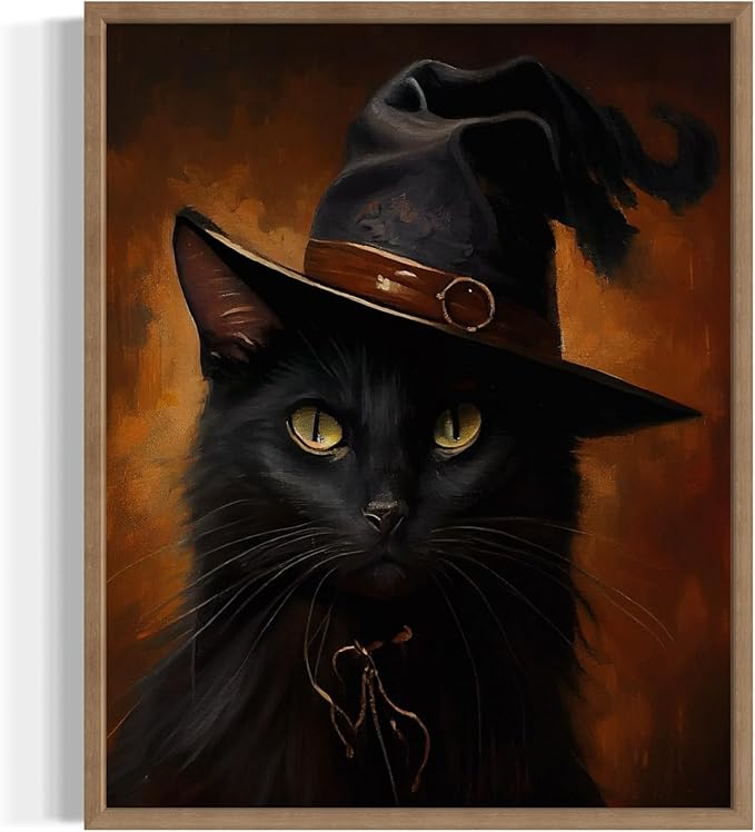 Witch Cat Poster Art Print, Halloween Scary Vintage Wall Art Academia Spooky Painting Decoration for Horror Prints, Gothic Posters Bedroom Decor 89 (Witch Cat, 16 x 20 inches, Wood Frame)