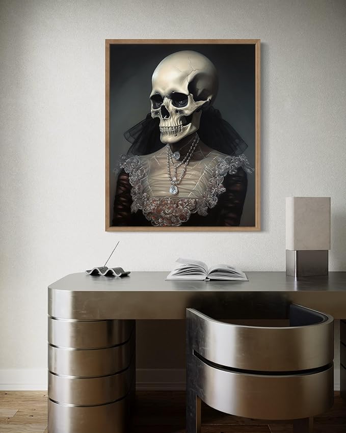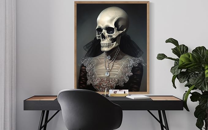 Female Skull Poster Art Print, Halloween Scary Vintage Wall Art Academia Spooky Painting Decoration for Horror Prints, Gothic Posters Bedroom Decor 89 (Female Skull, 8 x 10 inches, Wood Frame)